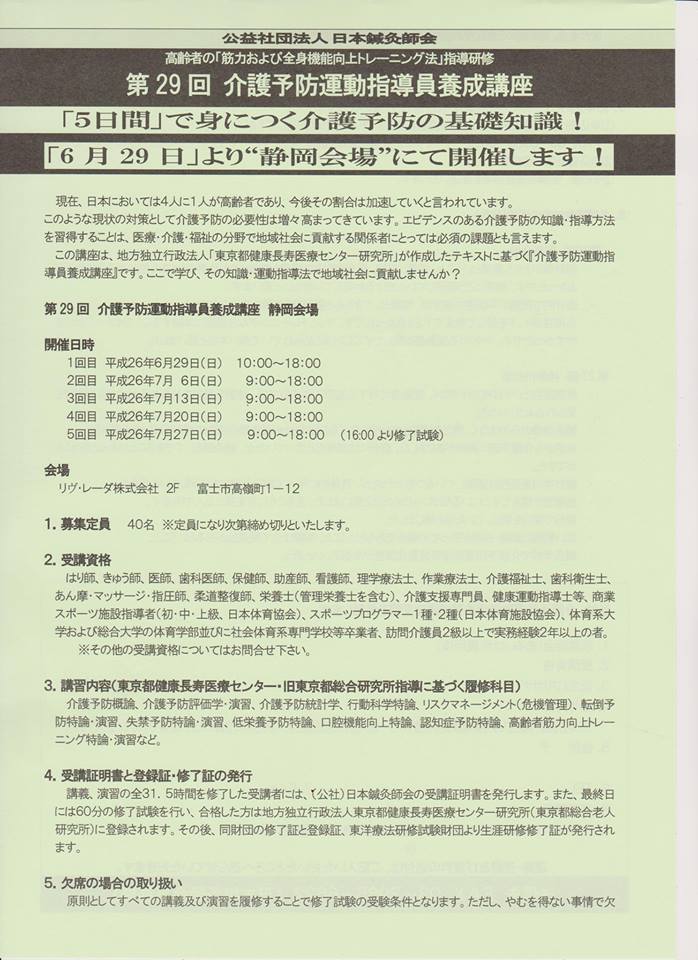 平成26年6月29日から介護予防運動指導員の養成講座を吉原のグラーダで開催します。
