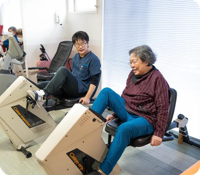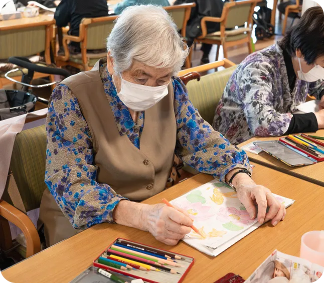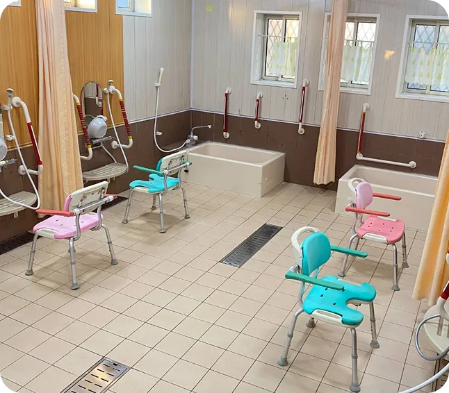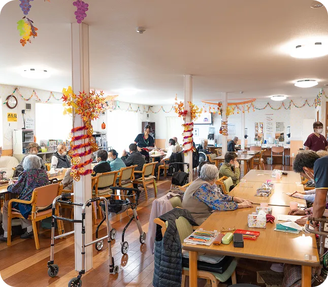 一日型のデイサービスで、機能訓練を中心に脳トレや集団レクリエーションなど、身体と頭を使う活動を行ったり、入浴や給食など、日常生活のサポートも行っています。