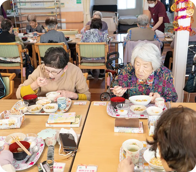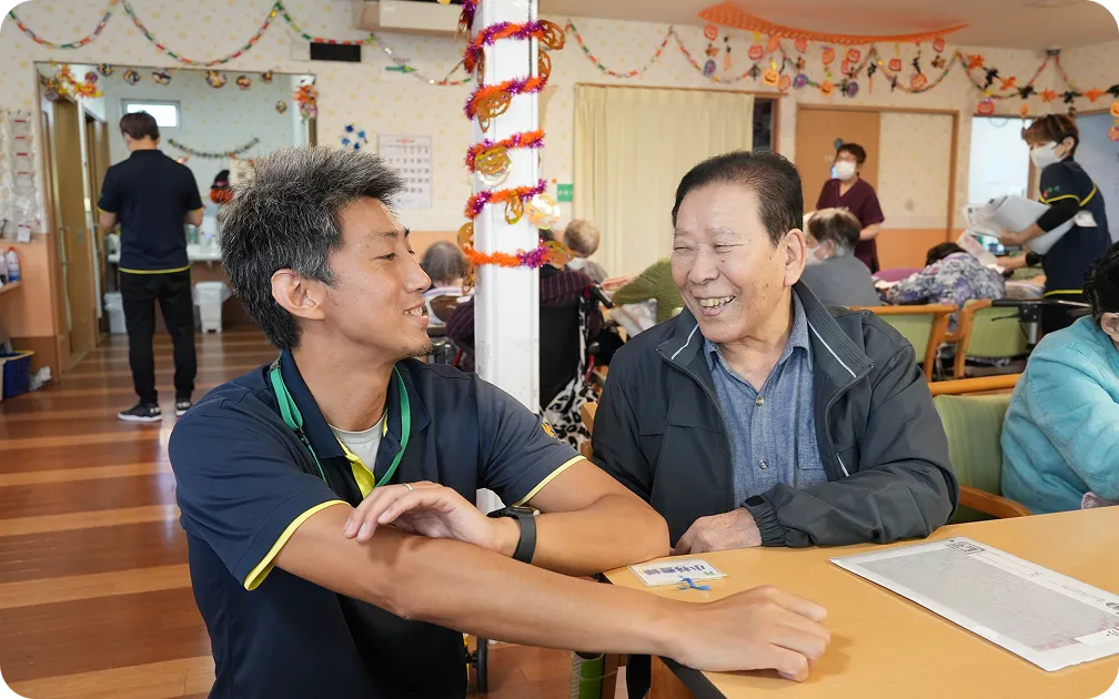 利用者様が「声を出して笑う」瞬間を大切にしています。 スタッフは、傾聴の姿勢を基本としながら、一人ひとりの個性や体調に合わせた温かい対話を心がけています。笑いや会話が生まれることで、心と体の活力が向上し、施設全体はいつも明るい雰囲気に包まれています。