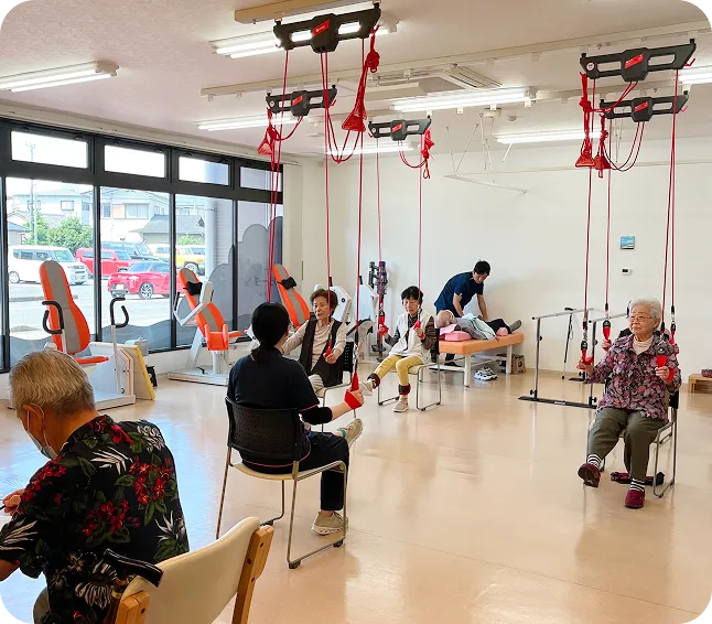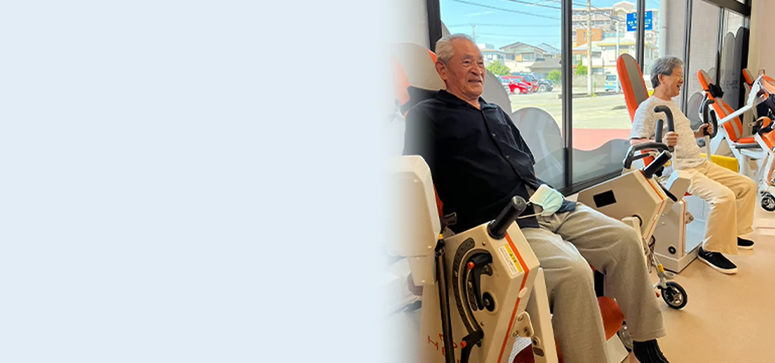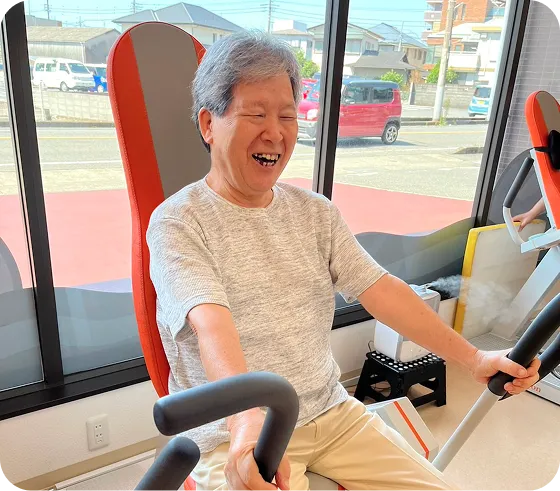 午前と午後に分かれた、運動に特化した半日型のデイサービスです。 「まだまだ元気だけど今後のために今から運動をしたい」「色んな人と交流したい」など、心と身体の健康のために”ジム感覚”で利用されている方が多くいらっしゃいます。 機能訓練士が一人一人に合った運動を提案しているので、安心して運動していただけます。また、リハビリマッサージも受けることができるので、可動域を出したり、運動後のリフレッシュもできます。