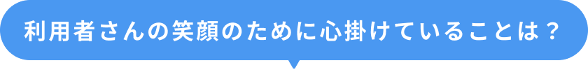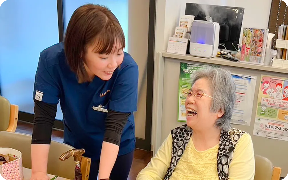 利用者様と、冗談を言い合ったり、身体の悩み、生活での悩み事などもお聞きしたり。利用者様それぞれの「その人らしさ」を尊重しながら、心を通わせる支援を心掛けています。
